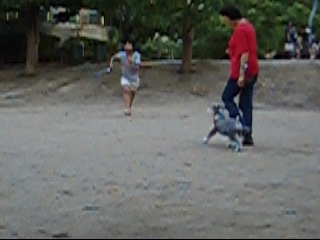 すぐ近くでお友達ワンコが走り回っていたり、子供たちがテニスに興じたりしている状況でも、タバサはハンドラー・ヒメちゃんママさんの顔をしっかり見上げてヒールしている。