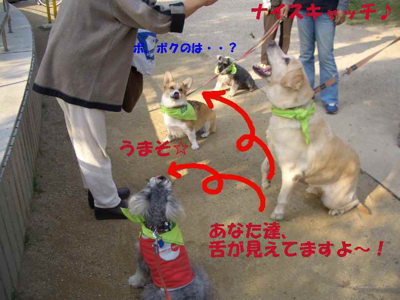 コーギーのCOCOちゃんとタバサは舌出して順番待ち。